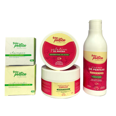 Além do Shampoo e Condicionador Sólidos, este kit inclui o Ativador de Cachos, a Gelatina Modeladora e a Máscara Nutrição Intensiva. Cada produto foi formulado com ingredientes naturais poderosos, como manteiga de karité, óleos vegetais e ativos nutritivos, proporcionando definição intensa, controle de frizz e brilho radiante. A Máscara Nutrição Intensiva oferece nutrição profunda, restaurando a saúde e a vitalidade dos seus fios, enquanto os outros dois produtos garantem cachos bem definidos e volumosos.